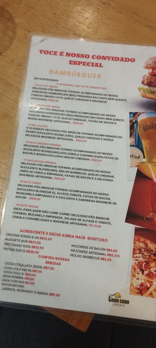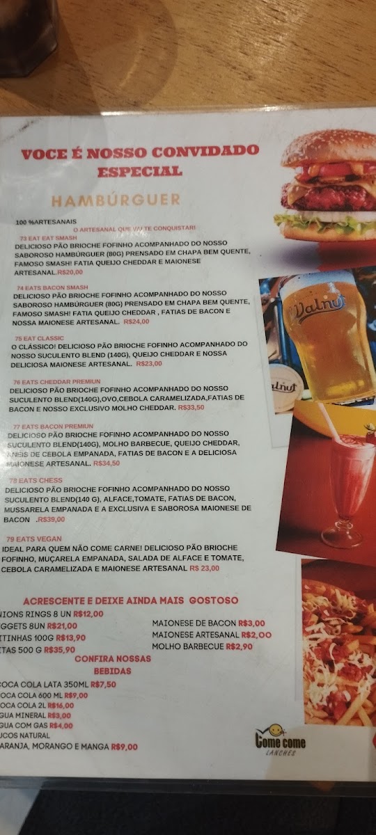 Welcome to Come Come Lanches Premium, a standout hamburger restaurant nestled in the heart of Conselheiro Lafaiete. Located at Praça Chiquito Furtado, this gem has quickly garnered a reputation for its artisanal burgers that leave taste buds dancing. The reviews from delighted customers highlight the sensational flavors, with menu favorites like burger number 77 earning rave reviews for their robust taste and quality.